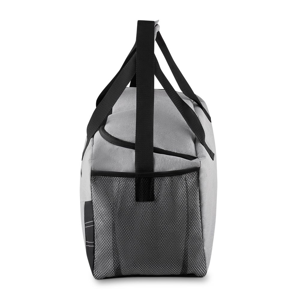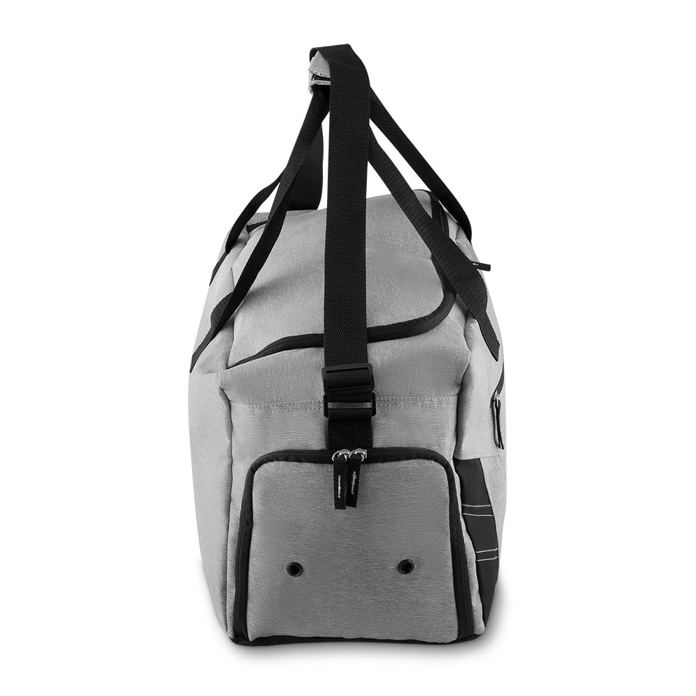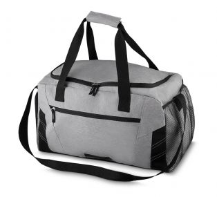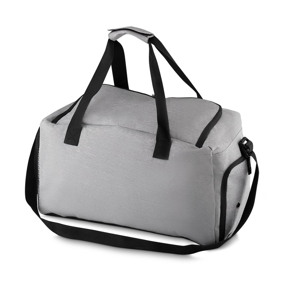 Descrição: Mala esportiva de poliéster. Possui bolso frontal, bolso lateral de malha, bolso lateral com zíper para calçados e bolso grande superior. Alça de mão com pegador cinza de velcro e alça para costa ajustável.