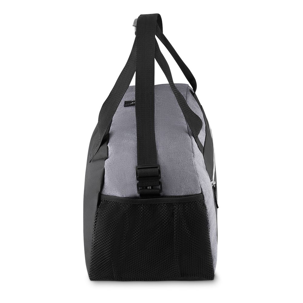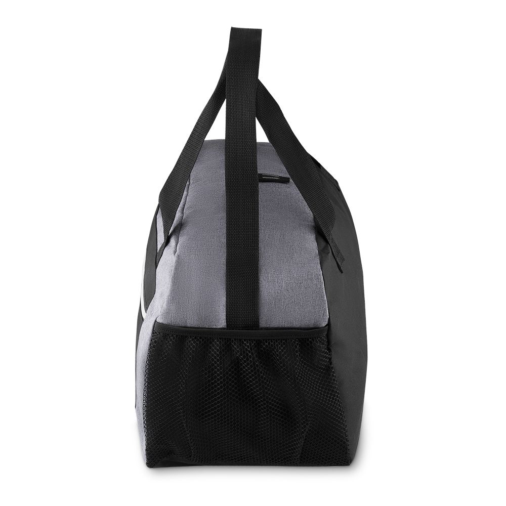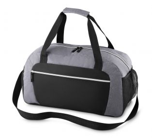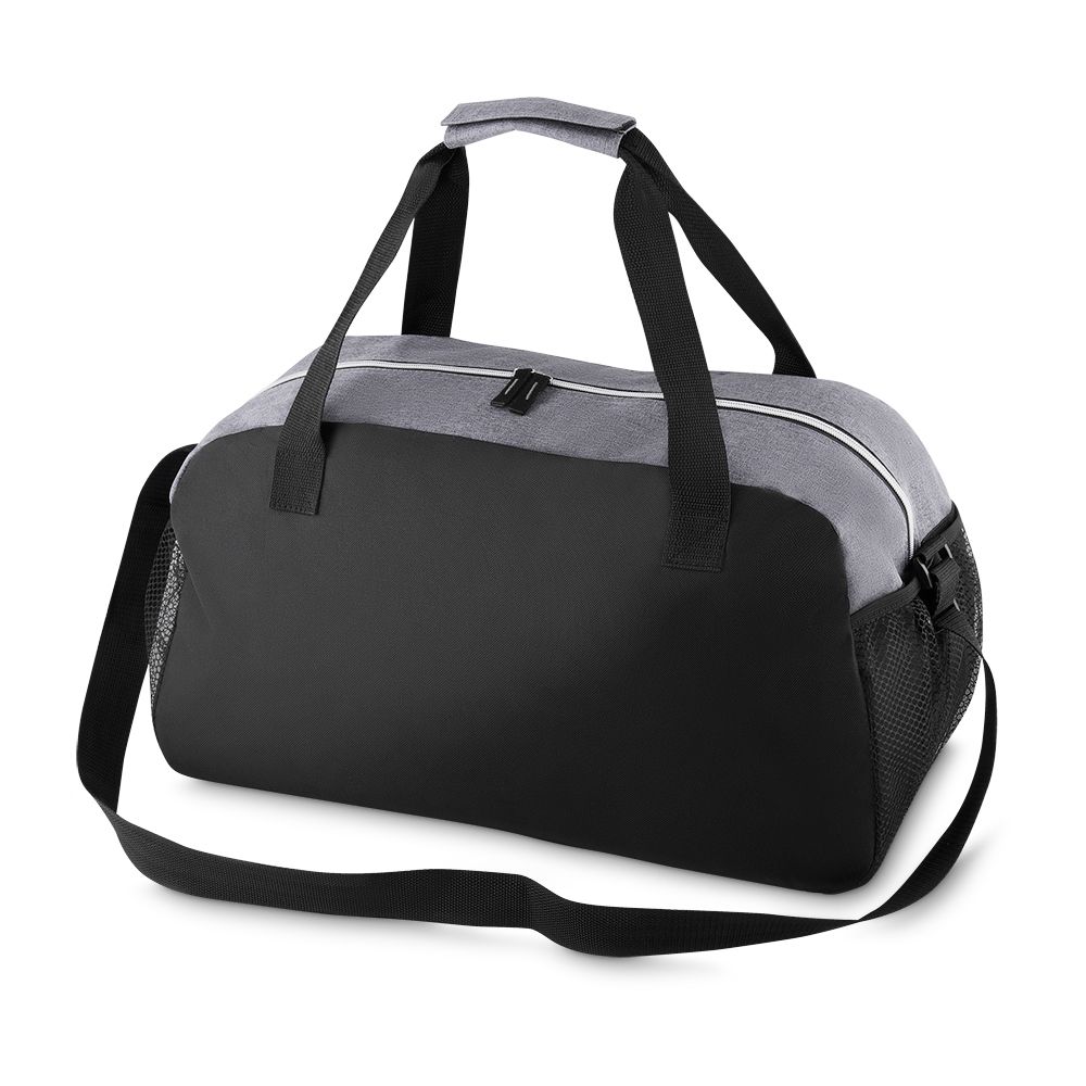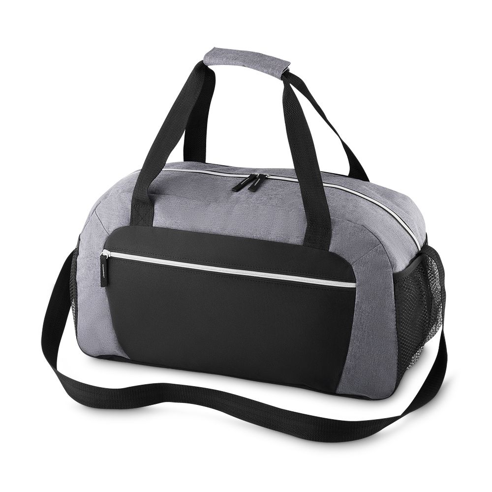 Descrição: Mala esportiva de poliéster. Possui alça de mão com pegador cinza de velcro, alça para costa ajustável e bolsos laterais de malha.