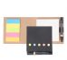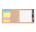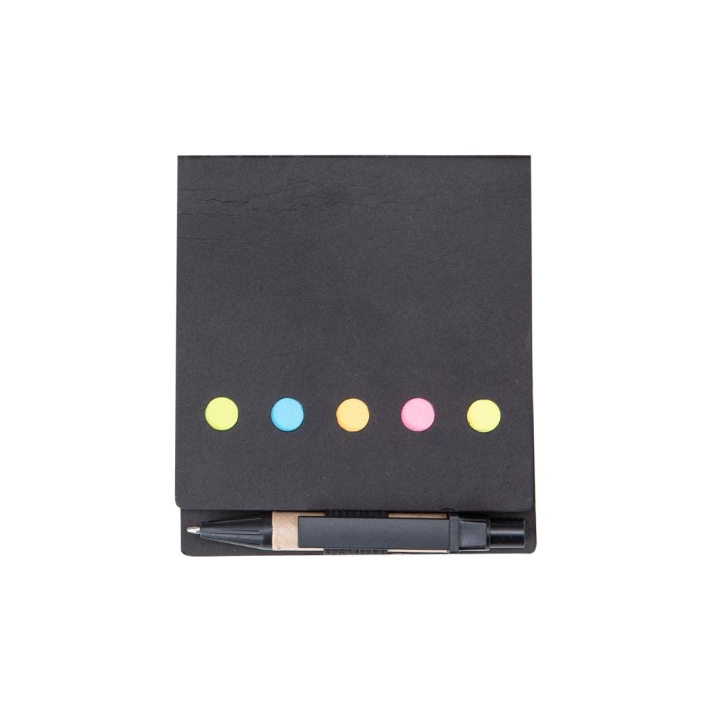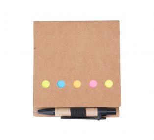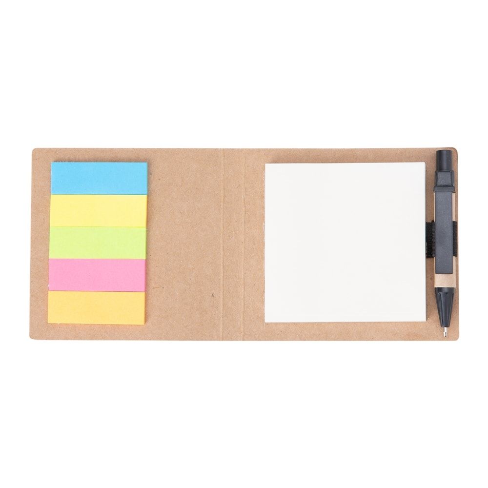 Mini bloco de anotações ecológico com post-it e caneta. Abertura superior, possui cinco detalhes circulares vazados na parte inferior. Bloco amarelo sem pauta com aproximadamente 50 folhas e cinco blocos auto-colantes coloridos com 21 folhas aproximadamente. Acompanha caneta ecológica de papelão com detalhes plásticos em suporte elástico.