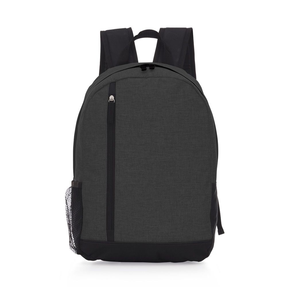 Descrição: Mochila de poliéster com compartimento principal superior e compartimento frontal com abertura lateral. Contém um bolso de nylon na lateral, alça de mão nylon e alças para costa ajustáveis.