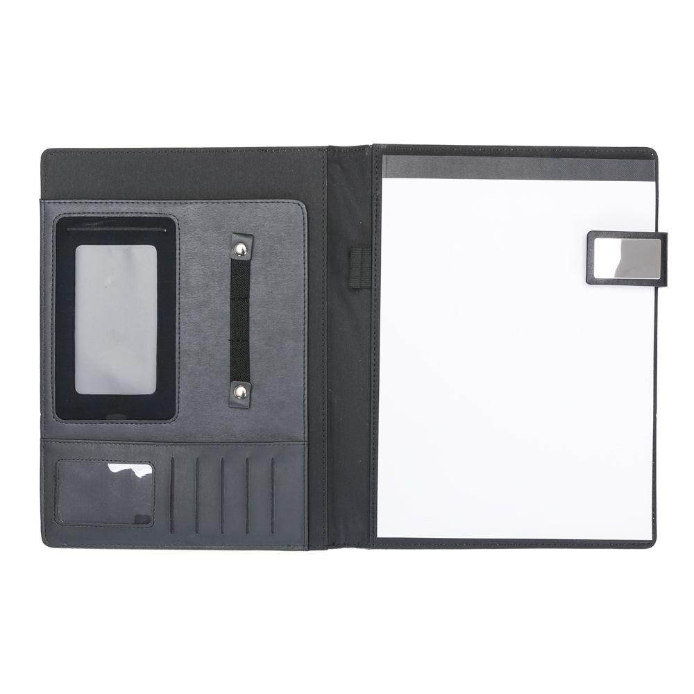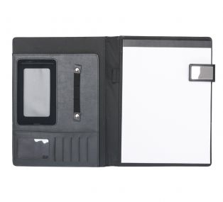 Descrição: Pasta convenção de couro sintético com trava de imã lateral, possui uma placa de metal na trava ideal para personalização. Possui “bolso” para arquivar documentos, porta celular com visor fosco, porta cartões com divisórias e visor além de um bolso atrás, suporte elástico para caneta(não acompanha) e bloco A4 com aproximadamente 20 folhas brancas pautadas de verso liso.