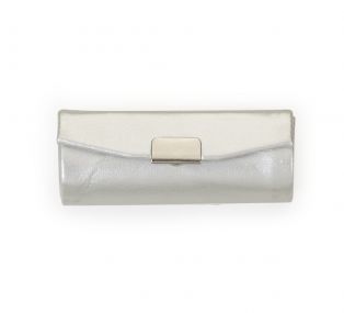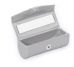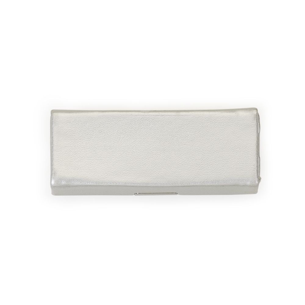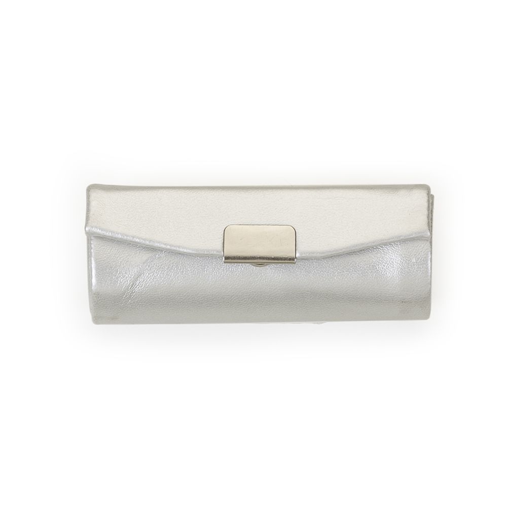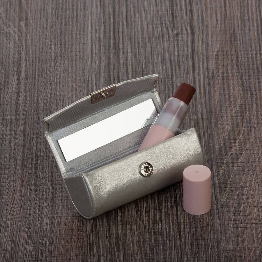 Descrição: Porta batom em couro sintético prata com plaquinha de metal frontal com botão para abrir/fechar, possui um espelho interno.
