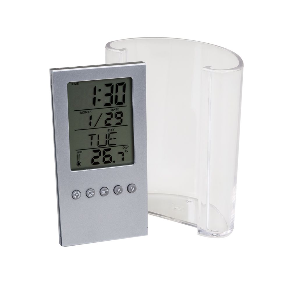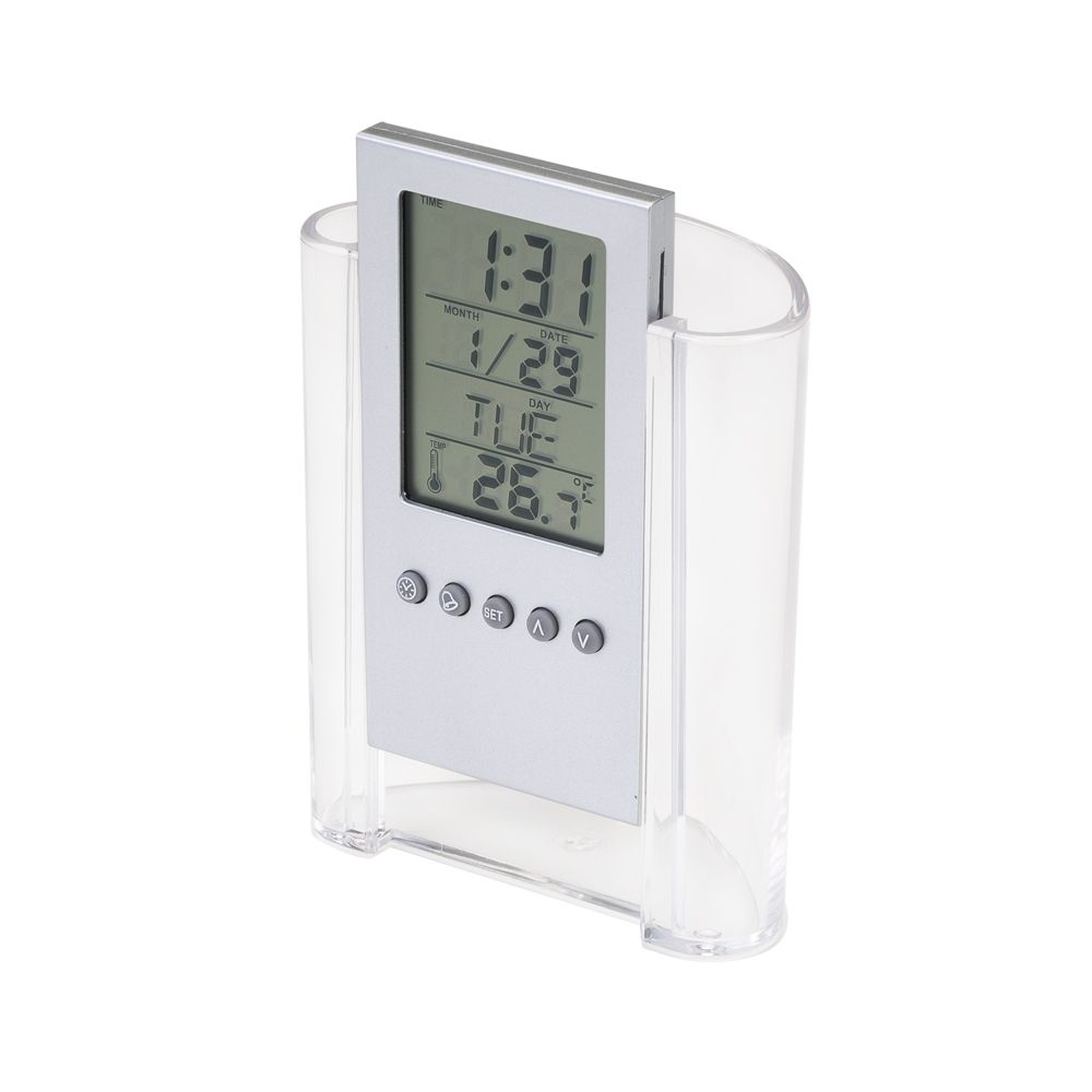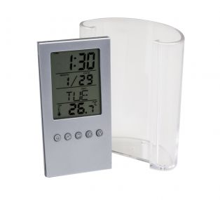 Descrição: Porta caneta acrílico com relógio plástico LCD(pode ser removido). Possui relógico plástico que pode ser removido. Fucionamento – Mode(desenho de um relógio): ao pressioná-lo poderá fazer alterações no sistema de visualização de horas(24hs ou AM/PM), alterações nas horas/minutos, ano, mês e data. Alarme(desenho de um sino): ao pressioná-lo poderá fazer alterações no alarme e toque do alarme. SET: altera o sistema de visualização de graus(Celsius ou Fahrenheit). Seta para cima: ativa o modo soneca. Seta para baixo: altera toques do alarme. Acompanha uma bateria CR2025.