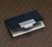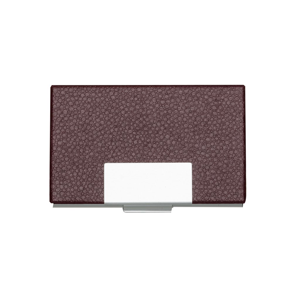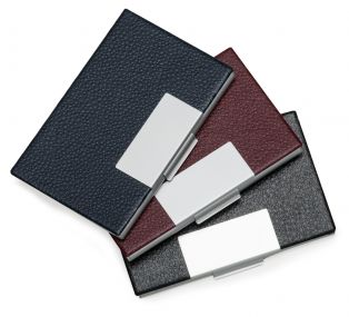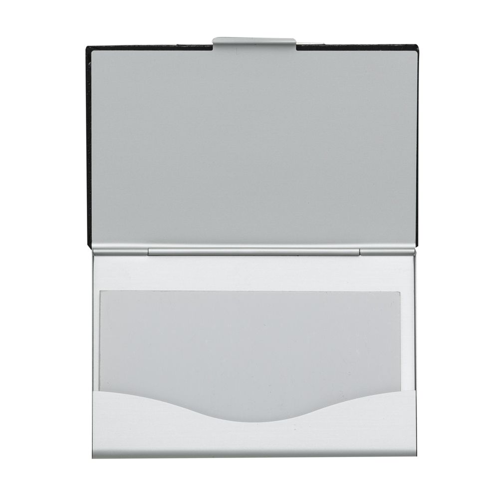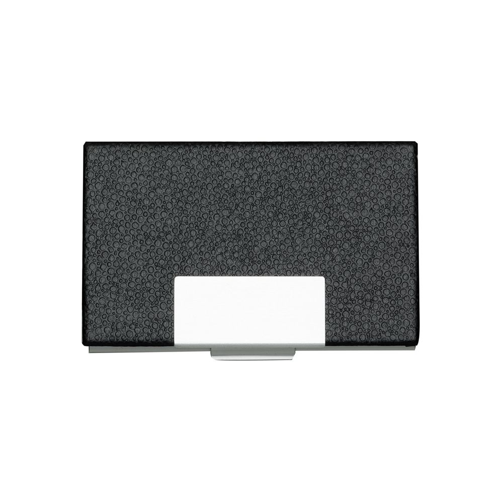 Descrição: Porta cartão em couro sintético com detalhes em prata. Possui chapa central em metal para gravação, parte interna e traseira em alumínio.