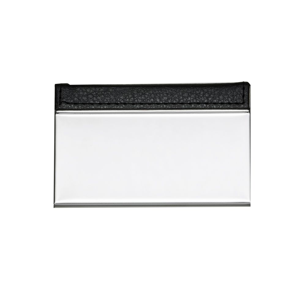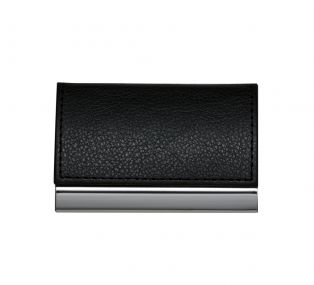 Descrição: Porta cartão de metal com couro sintético. Couro com textura e costura preta, parte interna revestida com veludo.