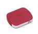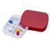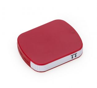 Descrição: Porta comprimidos plástico com quatro divisórias. Material plástico vermelho e "bandeja" branca, basta puxar a bandeja para a direita para abri-la. Possui duas setas pretas indicativas de qual é o lado certo de abrir a bandeja(para não correr o risco de abrir o item ao contrário e cair os comprimidos).