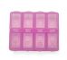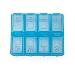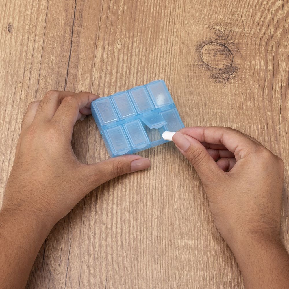 Descrição: Porta comprimido semanal em material plástico. Cada divisória contém a letra inicial referente o dia da semana(em inglês), possui oito divisões sendo a última para comprimido extra.