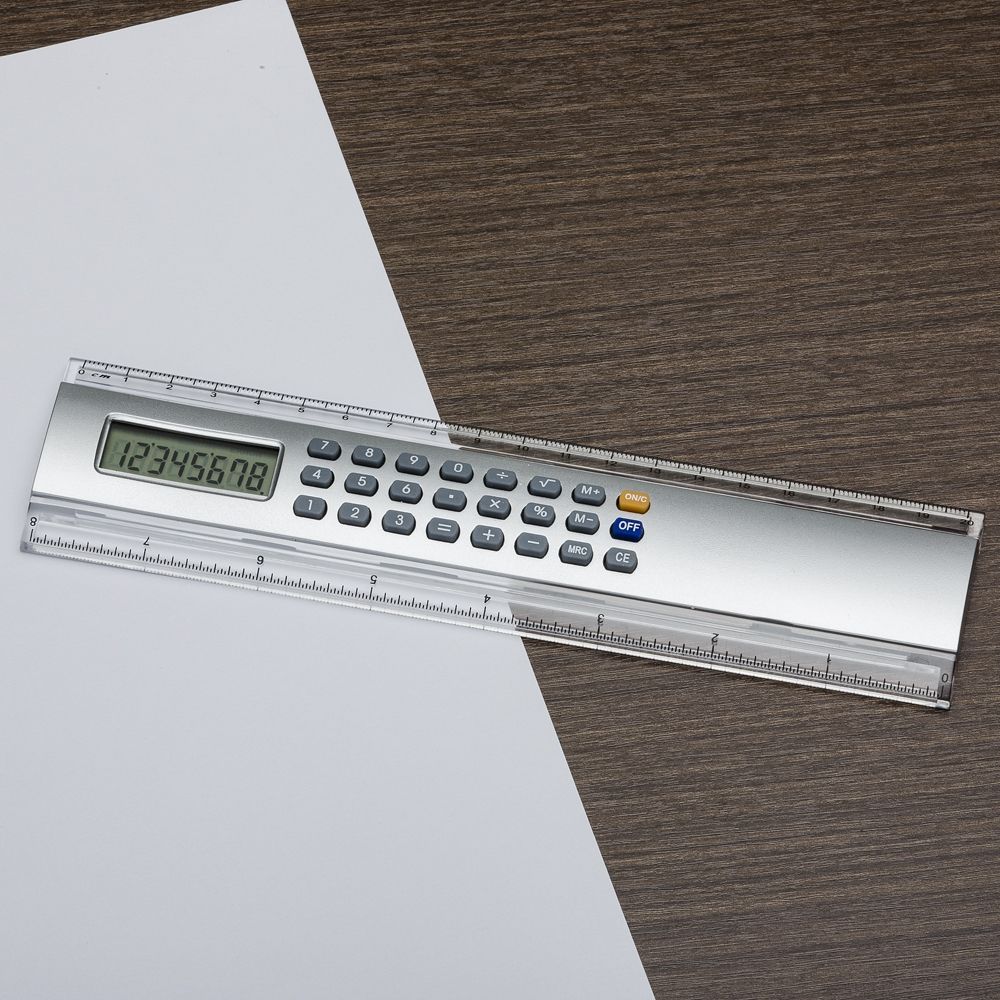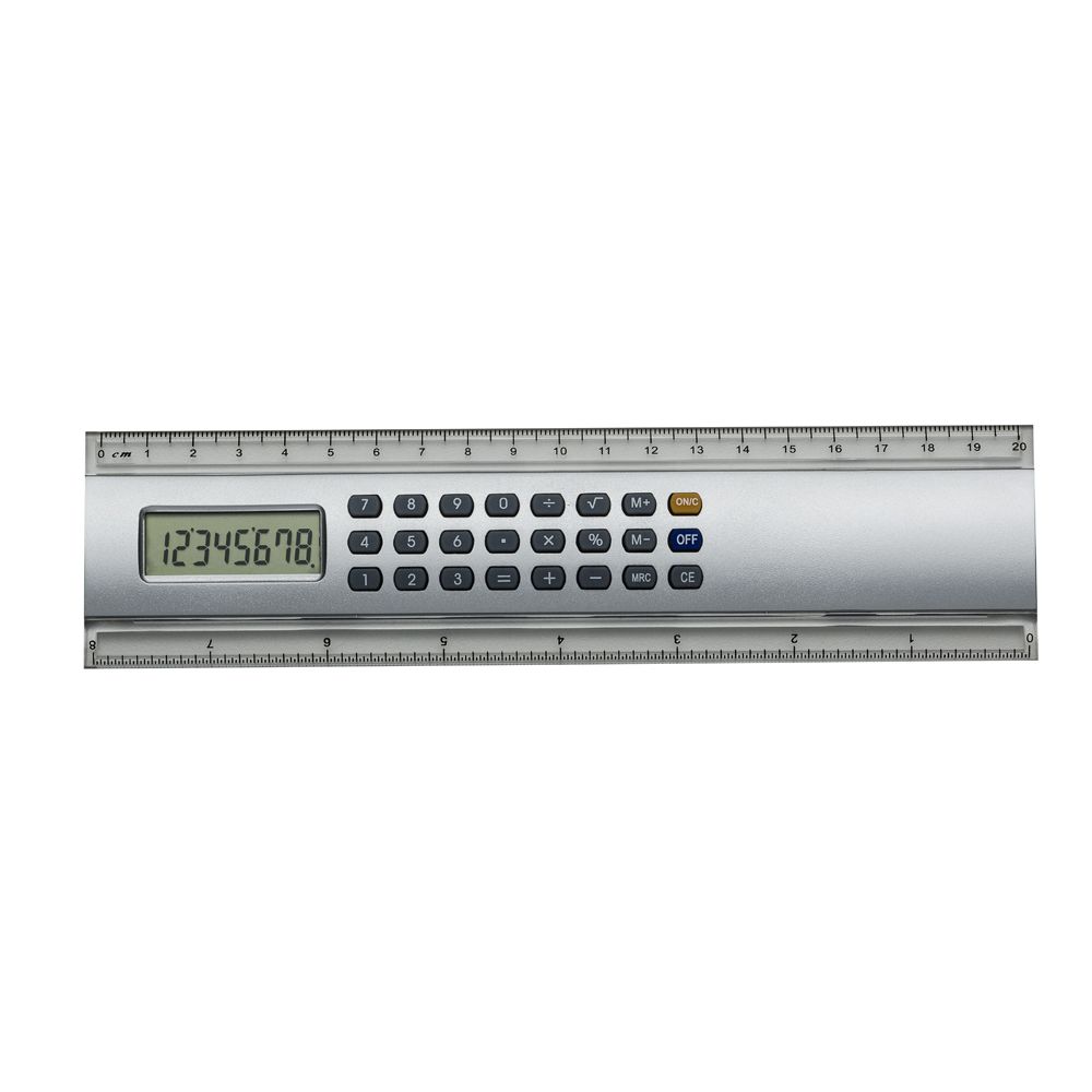 Descrição: Régua calculadora plástica 20cm. Calculadora de 8 dígitos com base prata, possui as medidas cm e polegada nas laterais plásticas transparentes. Acompanha uma bateria AG10.