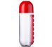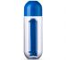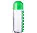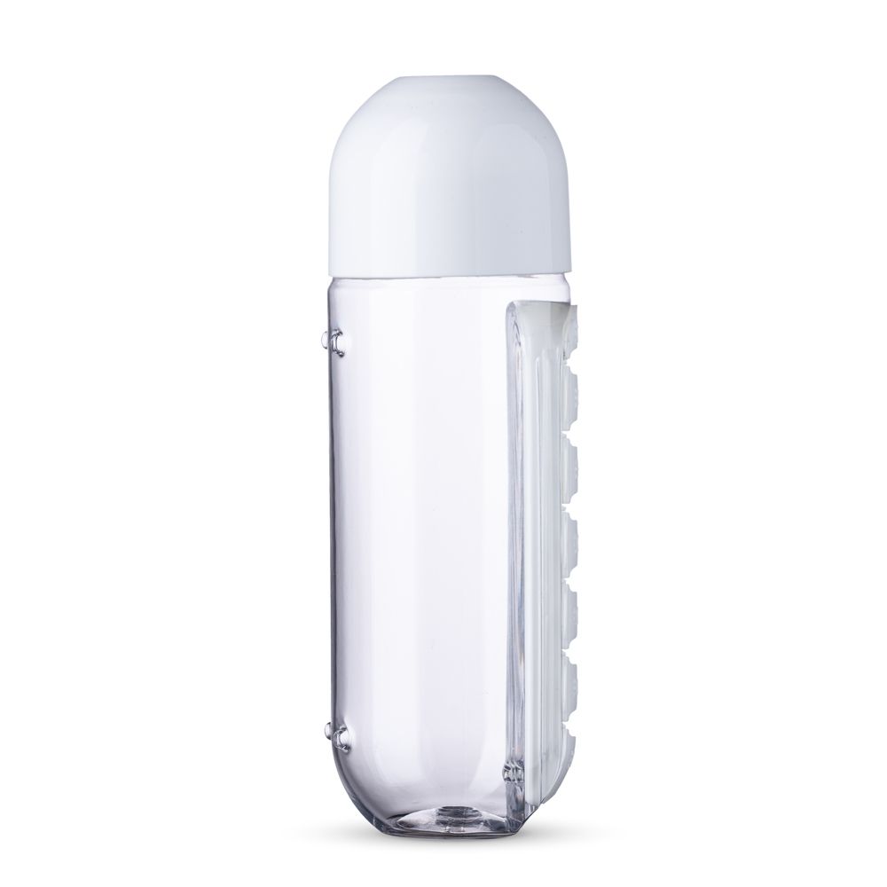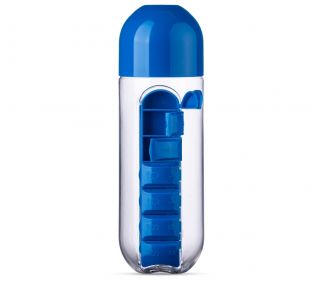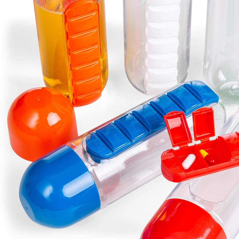Descrição: Squeeze 700ml plástico com porta comprimido. Garrafa transparente com encaixe para bandeja de comprimidos colorida, especificado por siglas referente os dias da semana, possui quatro “pézinhos” no qual auxiliam o squeeze a fica na posição horizontal. Tampa rosqueável colorida.