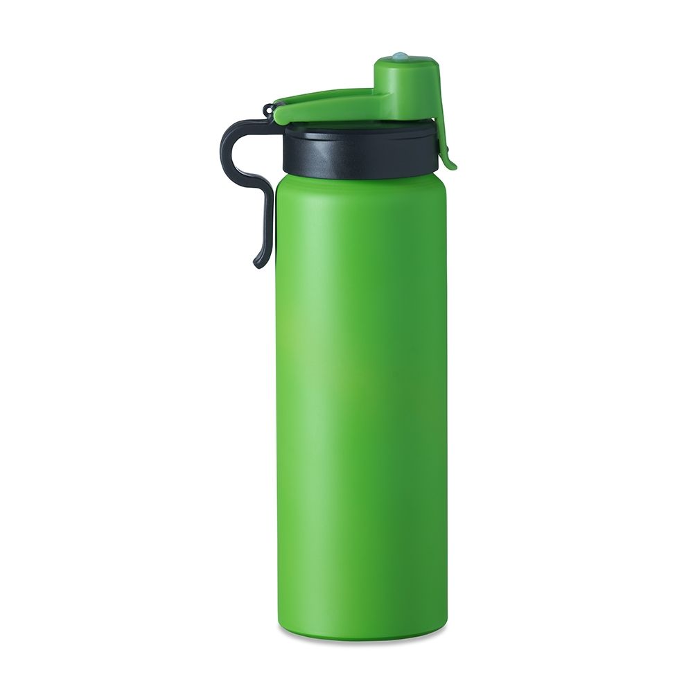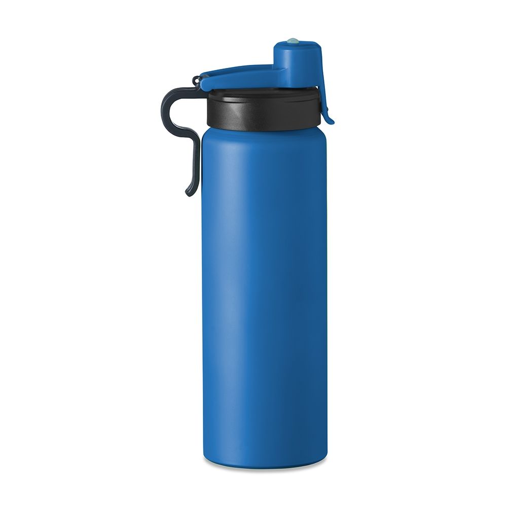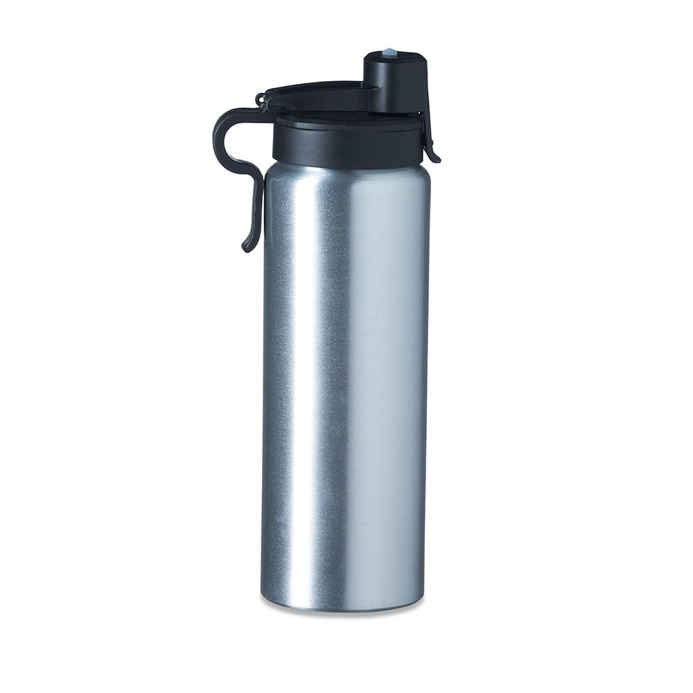 Descrição: Squeeze de alumínio 800ml com alça para transporte. Squeeze com pintura fosca e tampa rosqueável, possui também tampa protetora para o bocal.