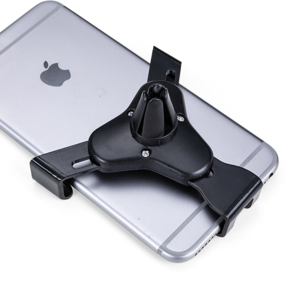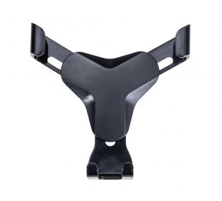 Suporte veicular plástico para celular. Suporte triangular com hastes que se adequam ao celular, com o peso do aparelho a haste inferior começa a descer e automaticamente as hastes laterais começam a fechar. Parte traseira com prendedor emborrachado para fixar saída de ar do veiculo.