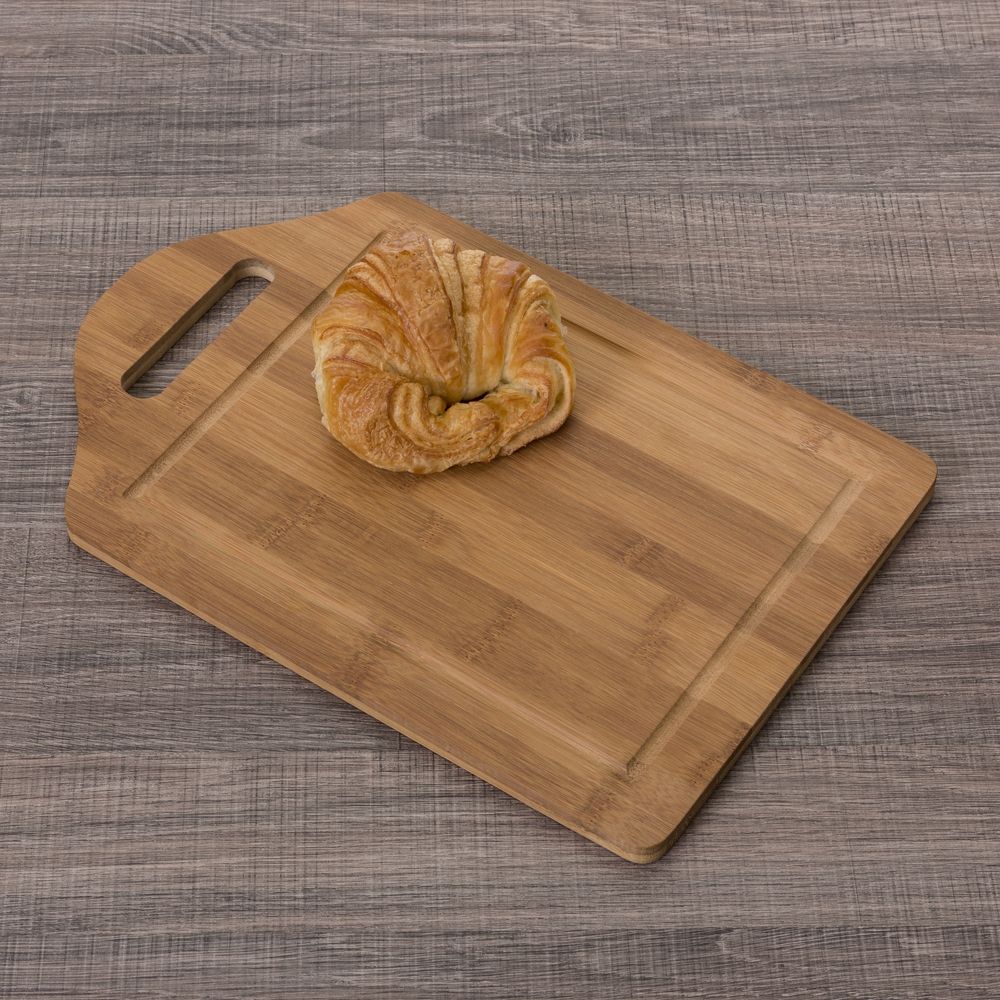 Descrição: Tábua grande de bambu para corte com canaleta e pegador.